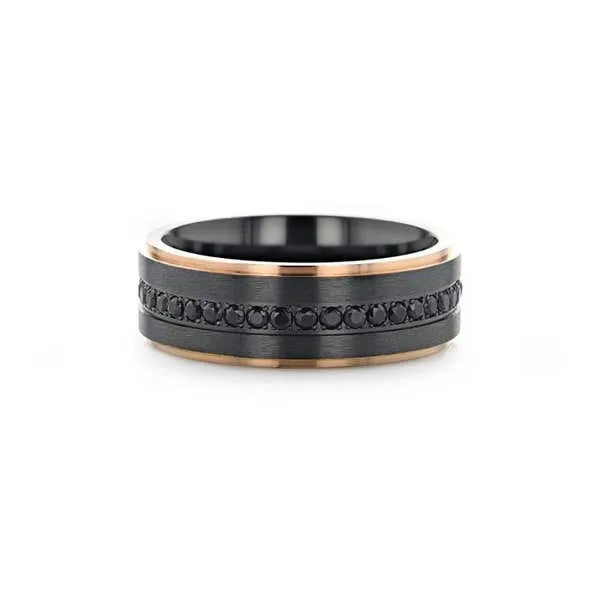 Flat Brushed Black Titanium Ring with Rose Gold Plated Edge and Black Sapphire Settings All Around