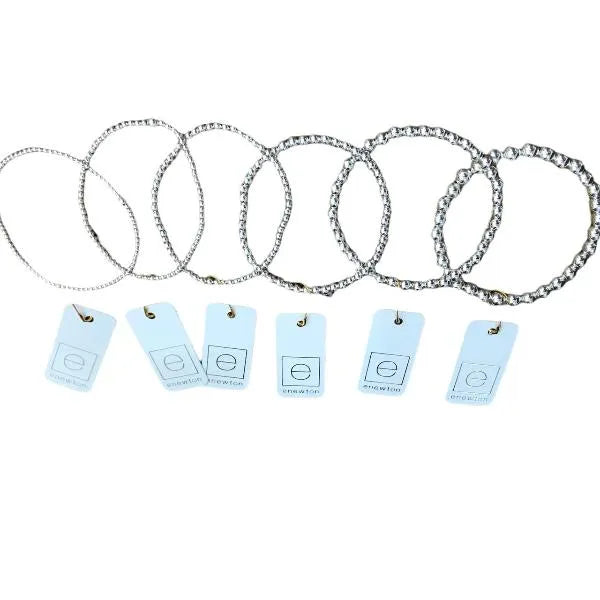 You're classic, reliable, and go-to bracelet, now in sterling silver! Made with 2mm, sterling silver beads Hand beaded on high performance elastic for a slight stretch to easily roll on and off your wrist Measures: standard 6.25" Stacks well with all bracelets Please visit ENewton website "Care" page for silver care instructions