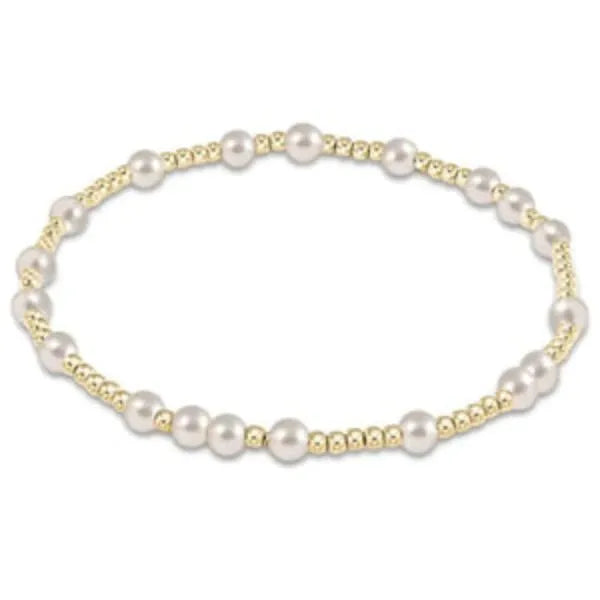 DESCRIPTION & DETAILS Anything is possible with hope. Made with 2mm, 14kt gold-filled beads and 4mm pearls Worry-free wear which means sleep, shower and sweat in it Hand beaded on high performance elastic for a slight stretch to easily roll on and off your wrist Measures: standard (6.25") Stacks well with all bracelets