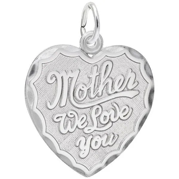 Rembrandt Charms, Mother We Love You Heart Charm. The Width is 7/8 of an inch. The Mother We Love You Heart Charm is a perfect gift for any mom, especially around Mother's Day. The Mother's heart charm can be placed on a necklace or will be a wonderful addition to a Charm Bracelet. All Rembrandt Charms are available in either silver or gold. (FUN FACTS: "4.3 babies are born every second".)