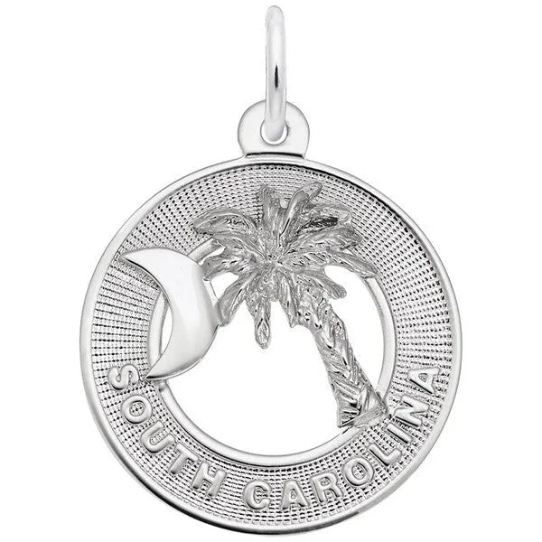 South Carolina Charm. "SOUTH CAROLINA" is inscribed on the front highlighted by a palmetto palm tree and crescent moon. This charm can be engraved on the back. (FUN FACTS: "The palmetto palm and the crescent moon are the symbols of South Carolina's State Flag".)