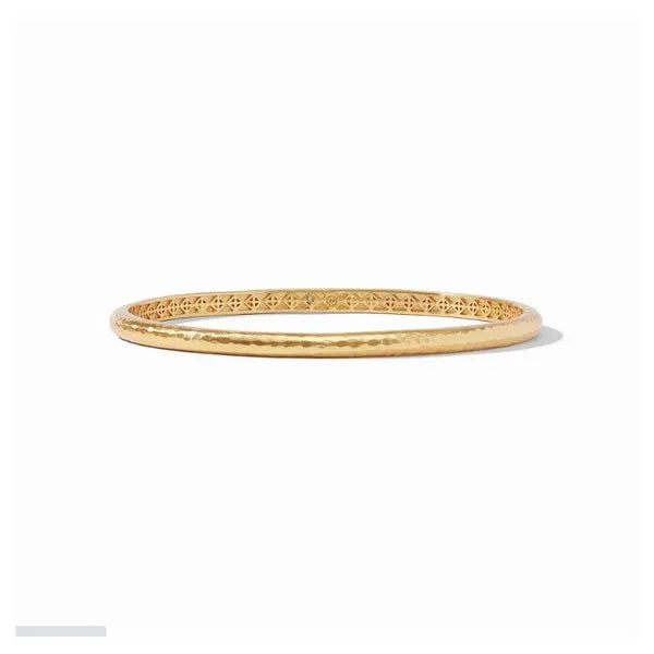 Elegant yet simple, this slim golden bangle features a lightly hand-hammered finish. An ornately geometric bas relief interior adds lightness and luxury for wearing stacked or solo. Product Details 24K gold plate Inner circumference: 7.8 inches (small), 8.1 inches (medium), 8.5 inches (large) Width: 0.15 inches Julie Vos hallmark