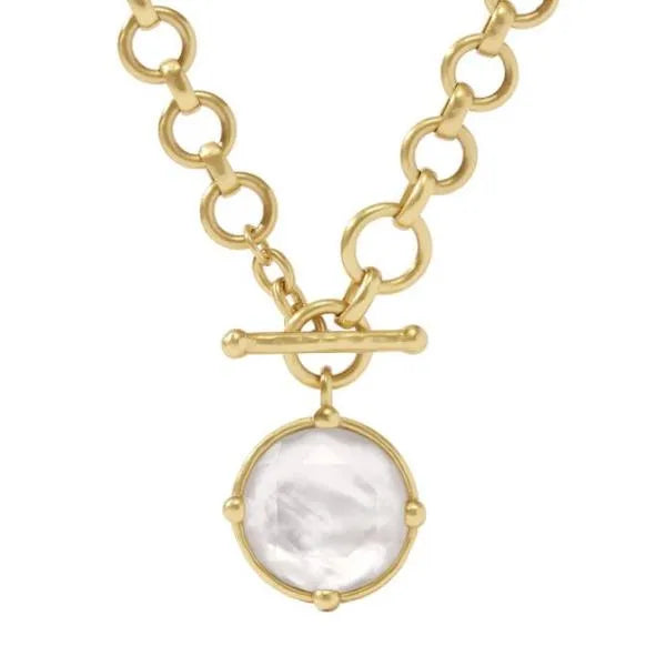 This demi-sized version of a favorite necklace has two ways to wear: Show the rose cut stone accented with golden beads or flip it to display a detailed bas relief bee. 24K gold plate, imported glass Length: 18.5 / 19.25 inches (adjustable) Julie Vos hallmark