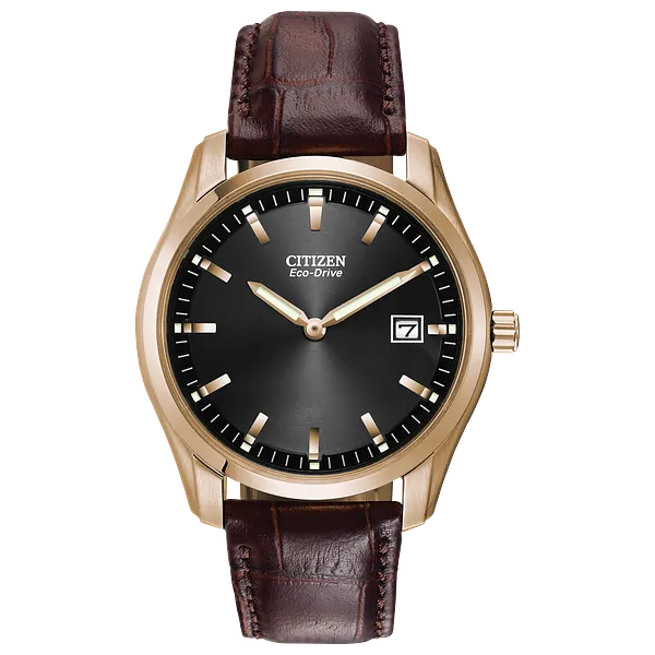 A watch like this says you mean business. Crafted in stainless steel rose gold-tone with a black dial, luminous hands, date indicator and sophisticated brown leather strap. Featuring our Eco-Drive technology – powered by light, any light. Never needs a battery. Caliber number J165.