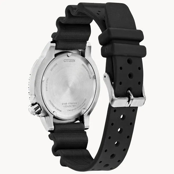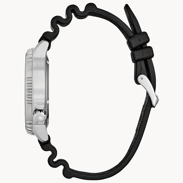 Inspired by the beautiful oceans that unite the world, the watches of Citizen's UNITE with BLUE series join the colors of the seven seas on one 100% recycled polycarbonate dial. This example, which comes as part of the dive-ready Promaster collection, marks a unique take on the classic sports style. The robust silver-tone stainless steel exterior ensures up to 200 meters of water resistance, making use of a 4 o'clock screw-down crown placement and an easy-grip bezel executed in a two-tone design is reminiscent of a sparkling emerald green ocean. A strap made from biomass-based polyurethane, which includes plant-based materials, secures the timepiece to the wrist. The highly-legible dial is brought to life through pigment-free ink that uses light – the same light that powers the Eco-Drive technology within – to reflect off the surface of the ink microstructures and create an array of aquatic shades. Caliber E168. This style is part of the UNITE with BLUE collection, which highlights Citizen’s commitment to sustainability including a Promaster Dive model and CITIZEN L Bianca style. Sustainably powered by the brand’s proprietary Eco-Drive*1 technology, both timepieces feature a structural color dial*2, inspired by the oceans that unite the world.