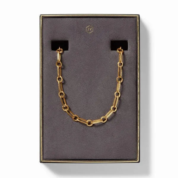 Shimmering lightly hammered oval links finished with a toggle closure. Two toggles for adjustable length. Product Details 24K gold plate Adjustable 19 - 20 inch length Julie Vos hallmark