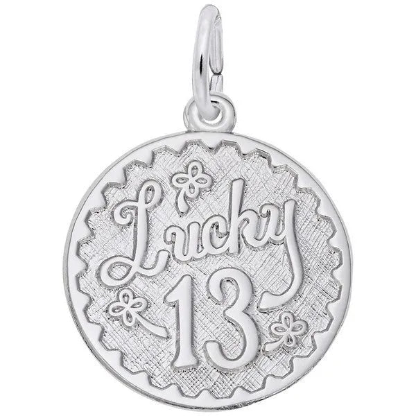 Lucky 13 Charm. "Lucky 13" is embossed in script on the front of the charm, and the back can be engraved. (FUN FACTS: "Has long symbolized fear or bad luck, but both the Chinese and ancient Egyptians considered the number lucky".)