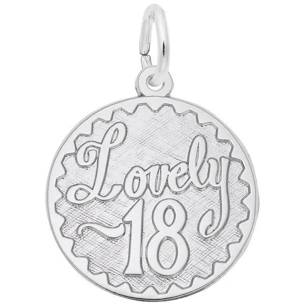 Lovely 18 Charm. Lovely 18 is embossed in script on the front of the charm, and the back can be engraved.