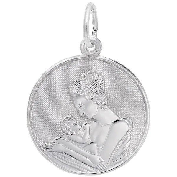 Rembrandt Charms, Mother Holding Baby Disc Charm by. Diameter 3/4 inches. A Mother's open arms are perfect at any age whether she just welcomed a newborn baby or has already raised us. This Mother cradling her baby charm is perfect to express your love by engraving the on the back. Mother and baby charm can be placed on a necklace or will be a wonderful addition to a Charm Bracelet. All Rembrandt Charms are available in either silver or gold.