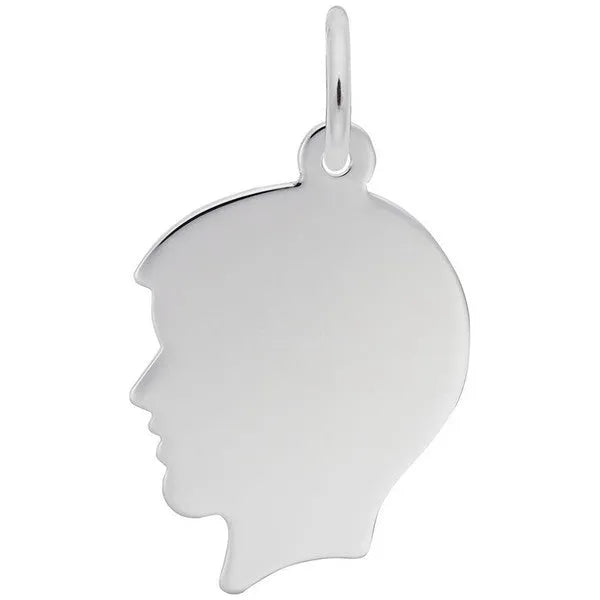 Rembrandt Boy's Head Charm. Capture his best moments with engraving this 3/4-inch flat boy's head charm on front and back. Perfect for remembering a certain milestone or just keeping him close. Our silhouette jewelry can be placed on a necklace as a pendant or will be a wonderful addition as a charm for a charm bracelet. All our jewelry is covered with a lifetime warranty backed by Rembrandt Charms. This charm is available in 14k gold, 14k white gold, 10k gold, sterling silver or even in gold plate over sterling silver. Rembrandt charms miniature works of art will help you recall special days and interests in your life, or those you love. The matching girl's silhouette charm is style 4430.