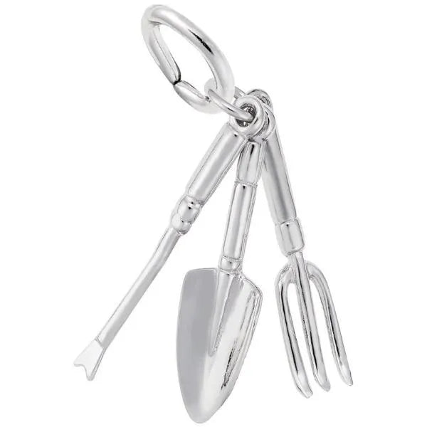 3 Dimensional Gardening Tools Charm. Three charms are joined together on one O-ring. (FUN FACTS: "One acre of forest absorbs six tons of carbon dioxide and puts out four tons of oxygen. This is enough to meet the annual needs of 18 people".)