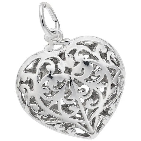 Rembrandt Filigree Heart Charm. 3 Dimensional Heart Charm is puffed and hollow inside with detailed filigree pattern all around. A perfect charm for your charm bracelet or worn on a necklace. 0.71 inches by 0.70...