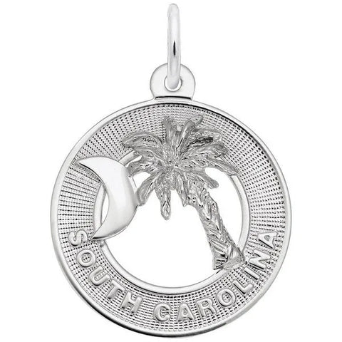 South Carolina Charm. "SOUTH CAROLINA" is inscribed on the front highlighted by a palmetto palm tree and crescent moon. This charm can be engraved on the back. (FUN FACTS: "The palmetto palm and the crescent...