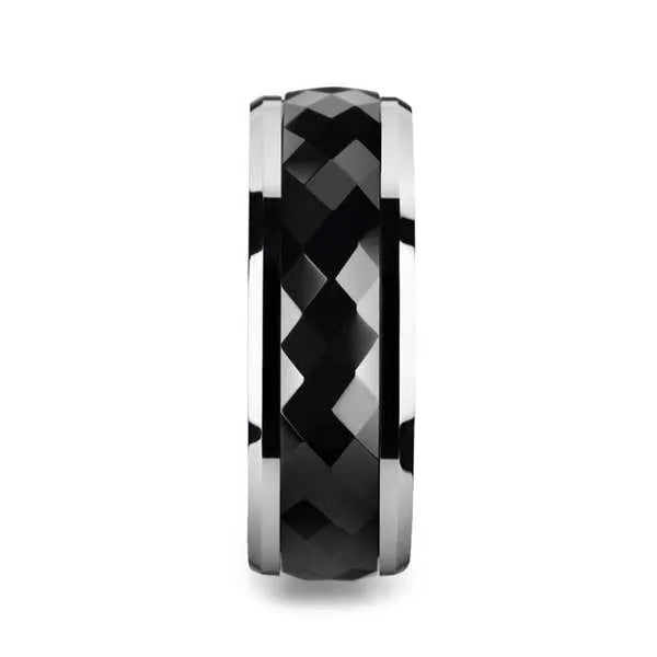 Polished Diamond Faceted Black Ceramic Spinner Ring with Beveled Edges