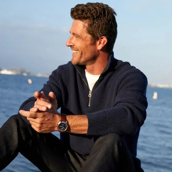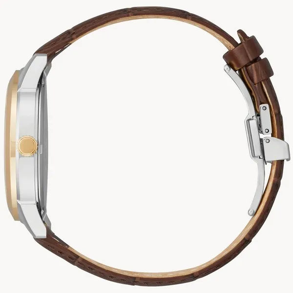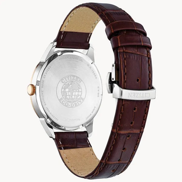 With a 40mm, stainless-steel rose-gold tone case and brown leather strap, Citizen’s Rolan watch is a paragon of timeless elegance. This vintage-inspired timepiece has a navy dial, rose-gold accents and uses Eco-Drive technology, so it is powered by light — any light. It also tracks the date, making it a functional, stylish addition to any wardrobe.