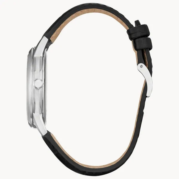 Classic lines and a simple silhouette define the newest addition to the Classic collection. This vintage-inspired timepiece features a silver-tone stainless steel case, a striking blue 3-hand dial with a date function, and a rich black leather strap with buckle closure. Sustainably powered by any light with Eco-Drive technology and never needs a battery.