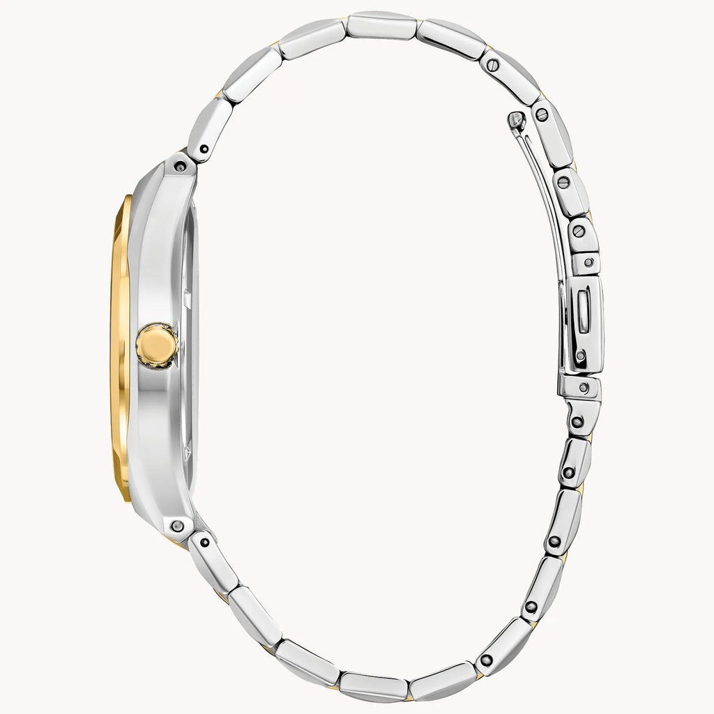 A classic timepiece is always in style in the Corso men’s watch from Citizen. Featuring a two-tone gold and silver-tone stainless steel bracelet and case with a 3-hand white dial and date indicator, luminous hands and gold-tone markers, this elegant timepiece also features a fold-over clasp closure with hidden push buttons and is water resistant to 100 meters. If you’re looking for a dress watch to add classic style to your wardrobe, look no further – the Corso is the perfect choice. It also uses Citizen’s Eco-Drive technology, so it is sustainably powered by any light and will never need a battery. Caliber number E111.