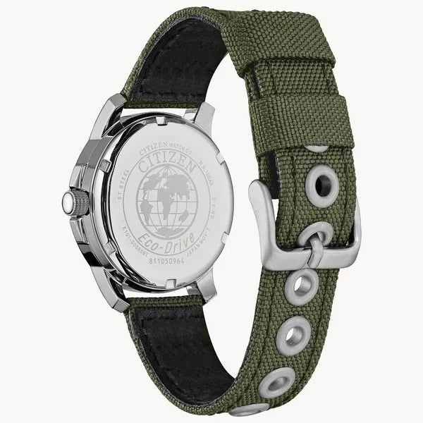 For a rugged look with a comfortable fit, this military-inspired timepiece fits the bill. with a day-date indicator, luminous hands, 37mm screw-back case, and 100M WR. The black dial provides a backdrop for simple Arabic numerals, housed in a stainless steel case along with a woven green strap with patterned stitching and a buckle clasp. Featuring our Eco-Drive technology – powered by light, any light. Never needs a battery. Caliber number E100.