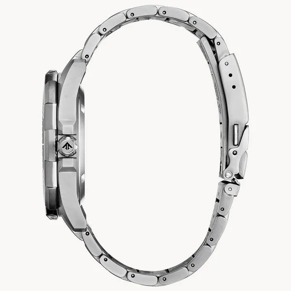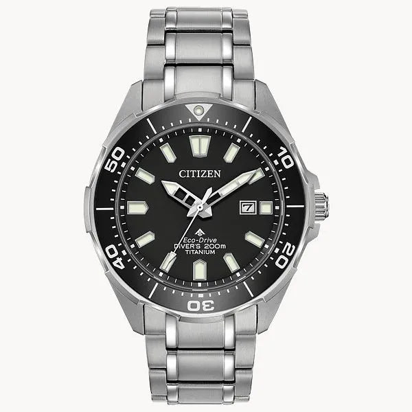 Proof that a dive watch can be fun & functional with the CITIZEN ISO-compliant Super Titanium Promaster Diver. With Eco-Drive technology, it is powered by light and never needs a battery, so you'll never need to open your caseback or compromise your dive again. Featured in a Super Titanium™ case and bracelet, aluminum bezel and black dial, one-way rotating elapsed time and WR200. Featuring our Eco-Drive technology – powered by light, any light. Never needs a battery. Caliber number E168.