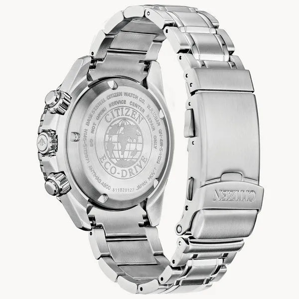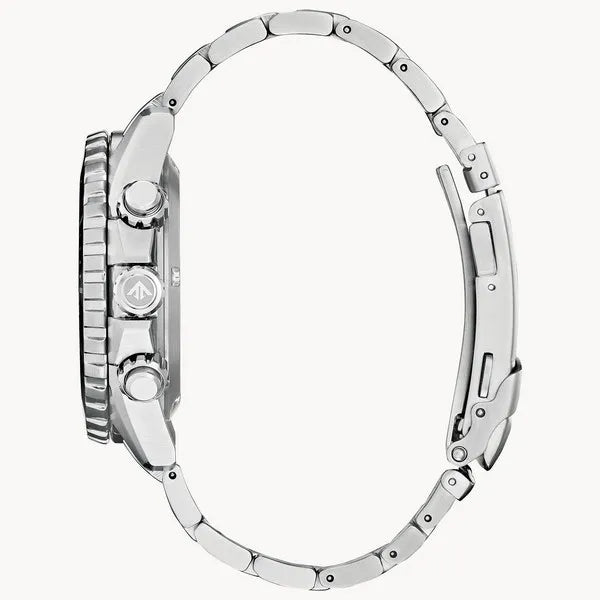 Citizen’s Promaster Diver is water resistant up to 200 meters, making it the perfect companion for your next underwater adventure. The stainless steel band and case are offset with a blue dial and luminous hand markers, so you can read it no matter where — or how deep — you are. Additional features include a chronograph, 12/24 hour time, the date, and a rotating blue bezel. It is also anti-magnetic and anti-shock, and is powered by light with Eco-Drive technology.
