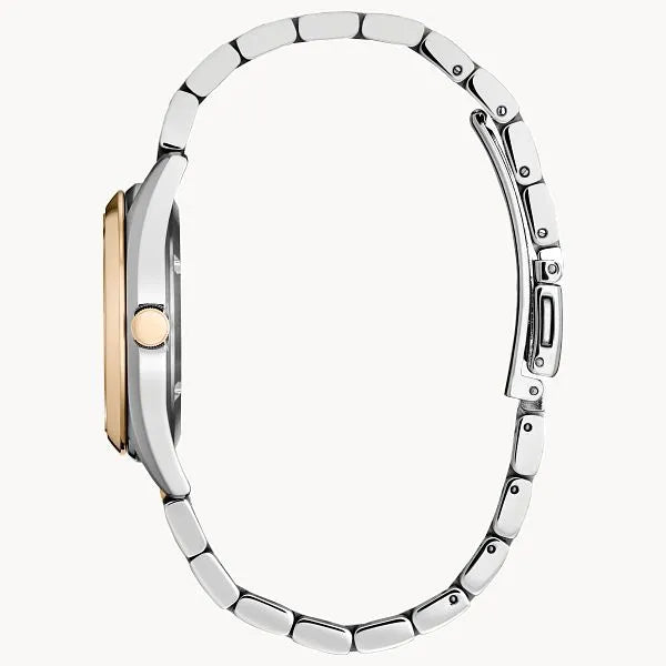 When sporty style meets luxury, you get this latest stunner from Citizen. Joining ready-for-anything wearability with feminine elegance, this time-and-date timepiece is the ultimate day-to-evening watch to wear. The two-tone stainless steel case measures 33mm in diameter and is presented on a matching, 3-link stainless steel bracelet for a sleek, versatile wear on the wrist. The radiant pink dial is characterized by its highly legible style and diamond accents, elevating the sporty wearer one step further. A water resistance up to 100 meters helps the dynamic watch maintain a host of functionality without compromising its alluring appearance. Powered by Citizen’s proprietary Eco-Drive technology to provide light-powered vitality continuously and sustainably without ever needing a battery. Caliber E013.