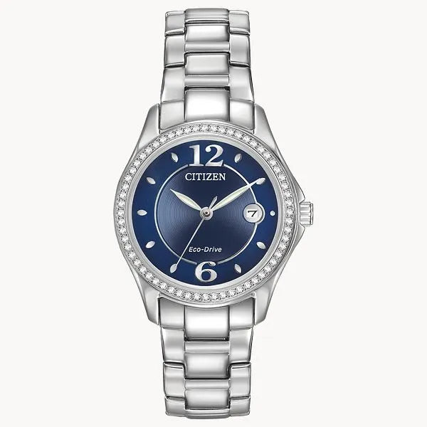 Classic lines and a hint of sophistication allow for this Citizen Silhouette Crystal timepieces to stand out. Shining bright with crystals and featured in a stainless steel case and bracelet with a cobalt blue dial. Includes date feature. Featuring our Eco-Drive technology – powered by light, any light. Never needs a battery. Caliber number J710.