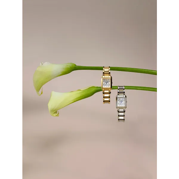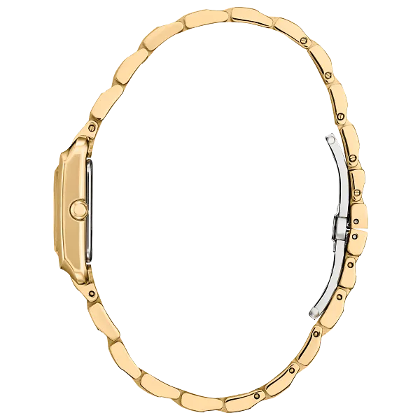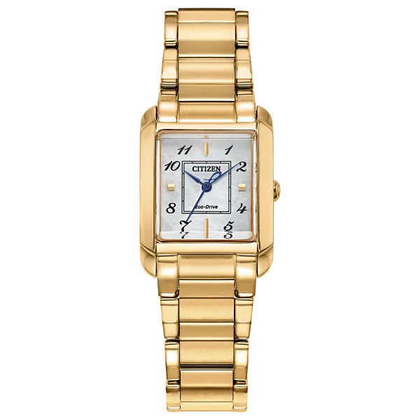 Classic lines and subtle sophistication make this latest piece to our women’s collection, the Citizen L Bianca, a charming addition of sustainable luxury. With a design inspired and celebrating feminine motifs in art deco, the distinctive gold-tone stainless steel timepiece is a captivating accent on the wrist that's perfect for everyday wear. A curved rectangular shape defines the watch's 22mm silhouette, with a subtle crown and gold-tone stainless steel bracelet rounding out the look. On its mother-of-pearl dial, alternating applied and printed markers work with a pair of blue-touched hands for a highly aesthetic style, with its printed inner square once again pointing to chic inspirations. Sustainably powered by any light with our proprietary Eco-Drive technology that never needs a battery, this elegant ladies’ watch is the perfect addition to any outfit. Water resistant to 50 meters. Caliber B035.