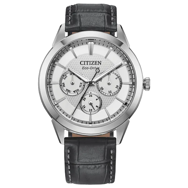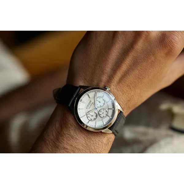 With vintage-inspired style that will never go out-of-date, this latest multi-function Rolan from Citizen takes the classic collection to the next level. The 40mm stainless steel case is the perfect base for the watch's matching silver-tone dial, with three sub-dials upon a textured inner sector adding to its unique appeal. Applied accents and a gray leather strap round out the look, with features including running and 24h time joining day and date indicators to balance the chic aesthetics with the functionality of this sophisticated timepiece. Sustainably powered by any light with our proprietary Eco-Drive technology and never needs a battery. Water resistant up to 100m. Caliber 8729.