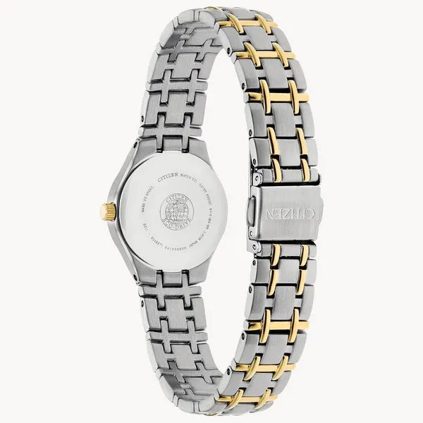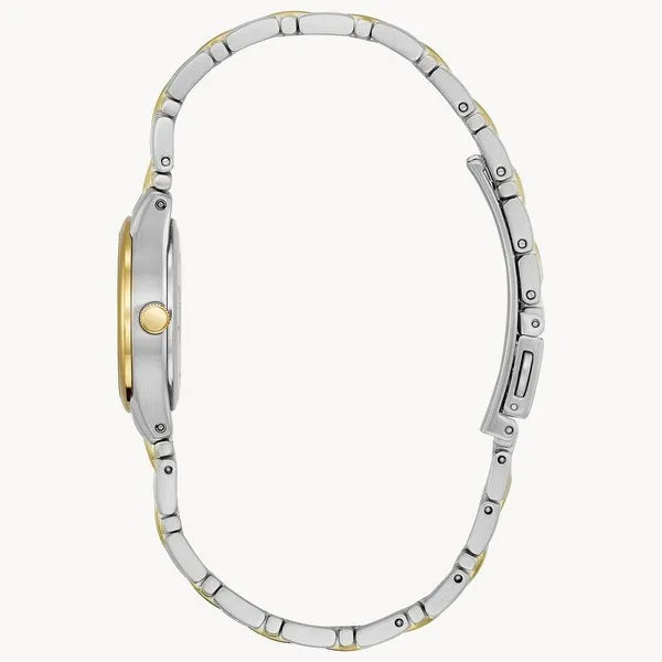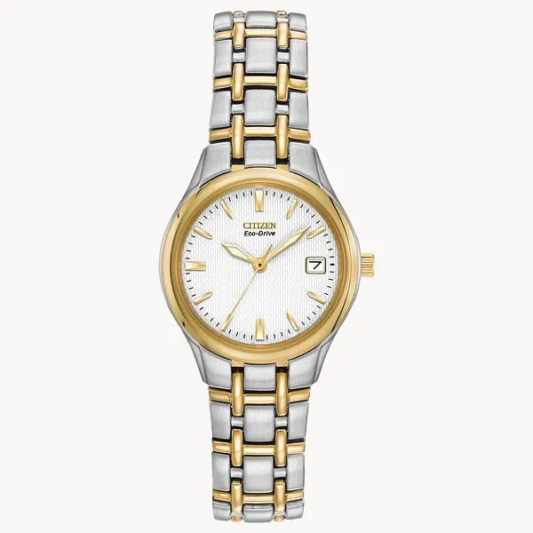 This Citizen Eco-Drive Silhouette is the epitome of versatility, making it perfect for any occasion. This is a 3-hand model with luminous hour and minute hands, a date indicator, and a clean white dial set in a stainless steel two-tone 25mm case and bracelet. Featuring our Eco-Drive technology – powered by light, any light. Never needs a battery. Caliber number E011.