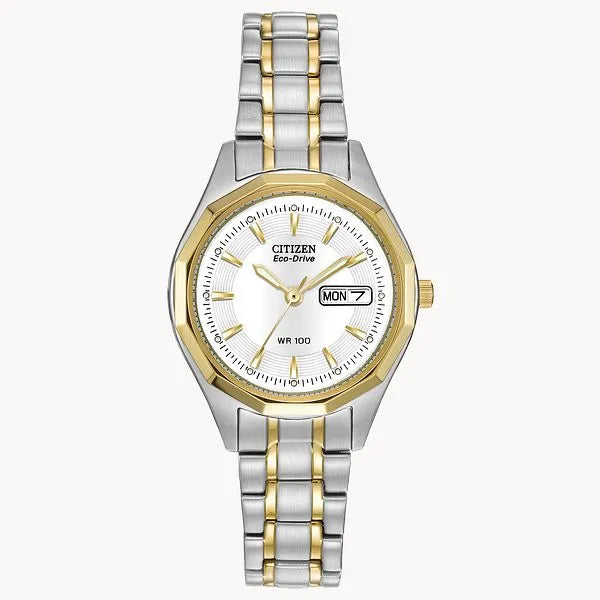 An unexpected 12-sided bezel lends a dash of extra style to this 3-hand Citizen Eco-Drive in stainless steel two-tone with 27mm screw-back case. Additional features include day-date indicator set within a white dial, luminous hands, water resistance to 100 meters, and foldover clasp with push button. Featuring our Eco-Drive technology – powered by light, any light. Never needs a battery. Caliber number E001.